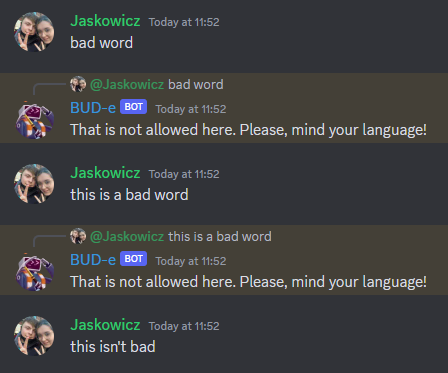 Sometimes, you may want to listen out for a message, rather than a command. This could be used for many cases like a spam filter, a bot that would respond to movie quotes with gifs, or a chat bot! However, in this page, we'll be using this to create a moderation filter (detect bad words).